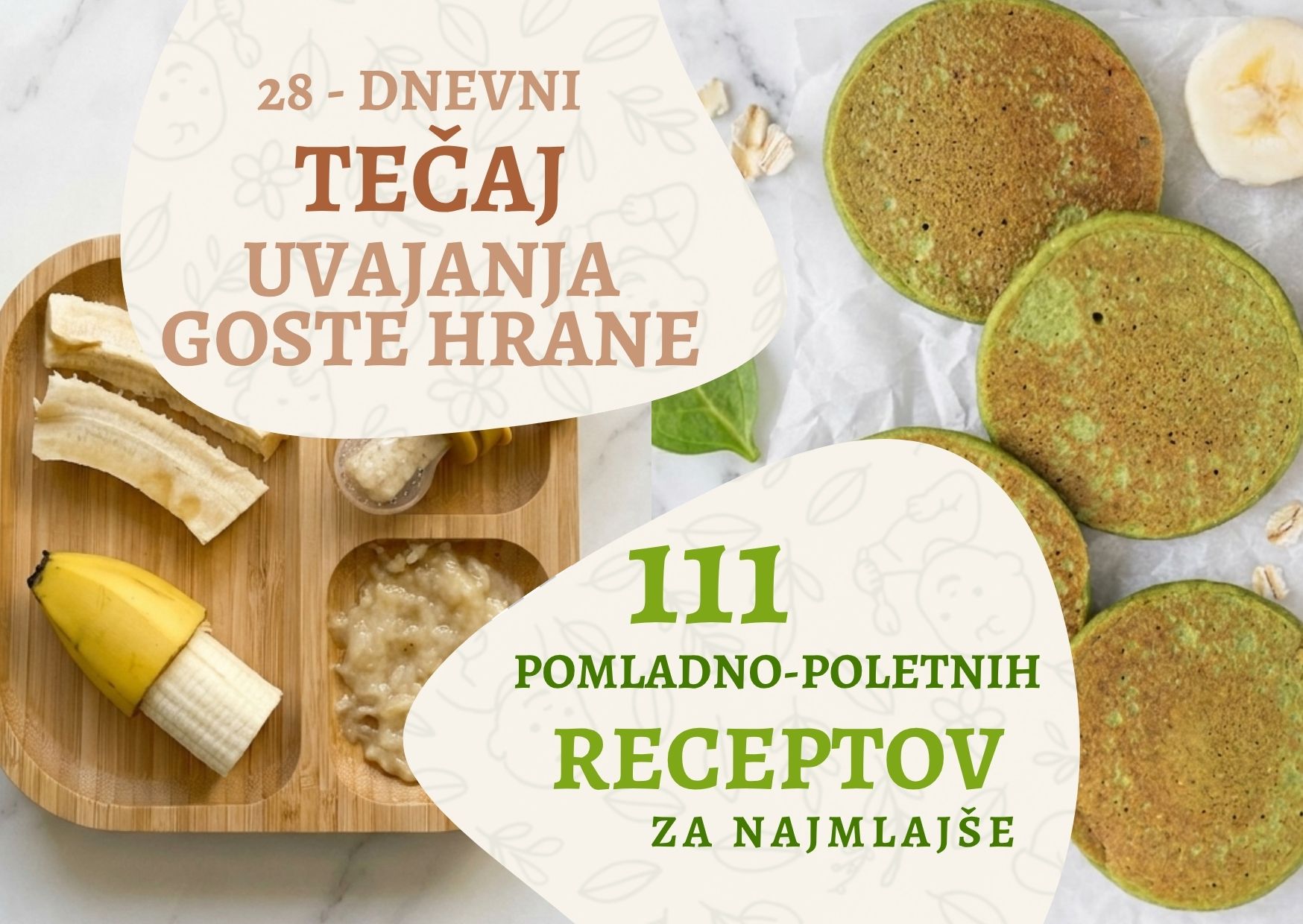 Z nakupom tega paketa prejmeš 4-tedenski plan uvajanja prvih živil in obrokov v prehrano dojenčka in vso potrebno teorijo s katero moraš biti seznanjen/a ter 111 pomladno-poletnih receptov, ki ti bodo pomagali, da tudi po končanem 28-dnevnem tečaju dojenčku pripravljaš hranilno bogate obroke.