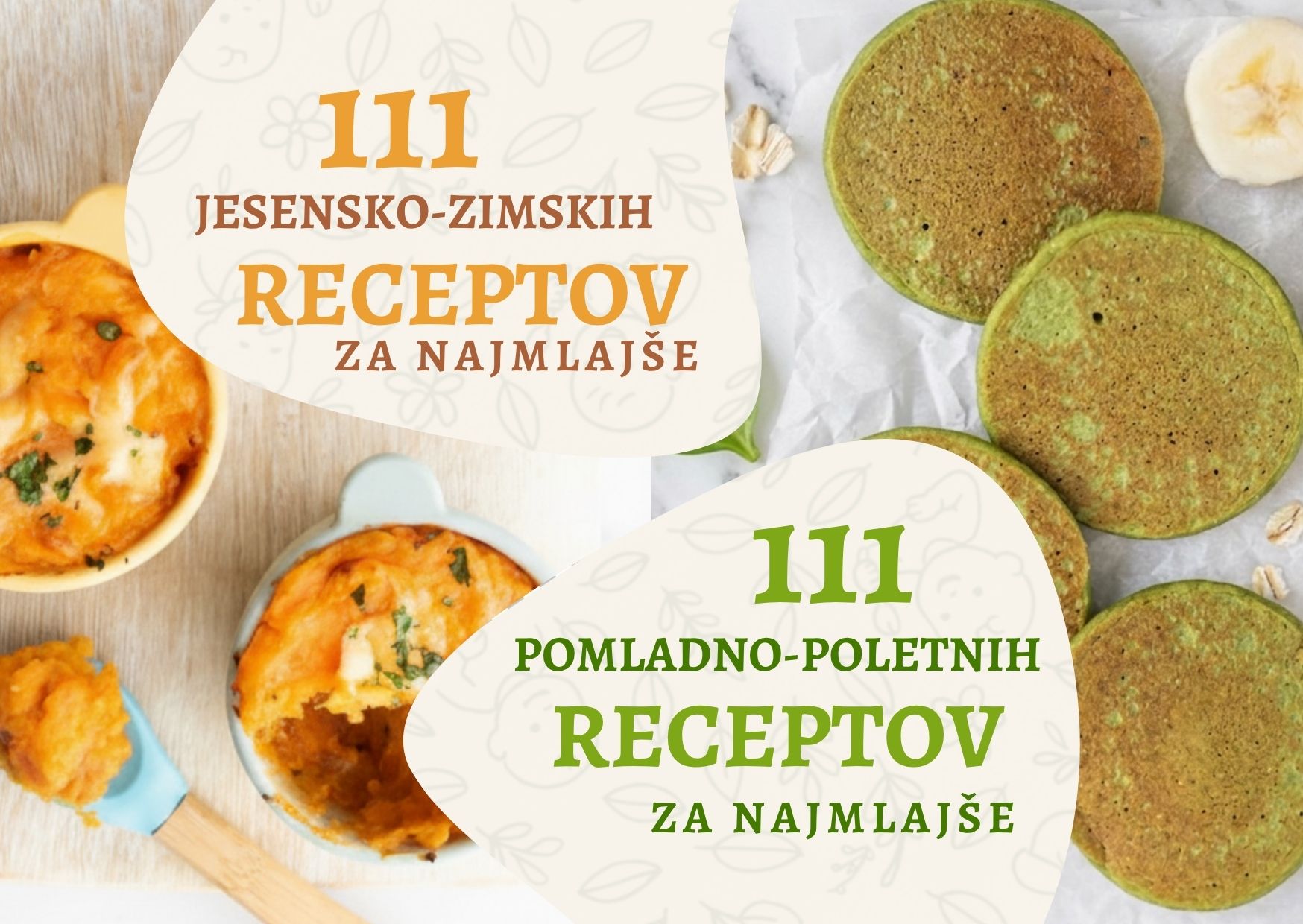 Z nakupom knjižic 111 pomladno-poletnih receptov in 111 jesensko-zimskih za najmlajše prejmeš ideje za vse obroke v dnevu, ki jih lahko izbiraš na podlagi živil, ki so trenutno v sezoni. Recepti so prilagojeni hranilnim potrebam dojenčkov in otrok, odlični pa so tudi za družinsko prehrano.